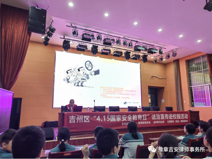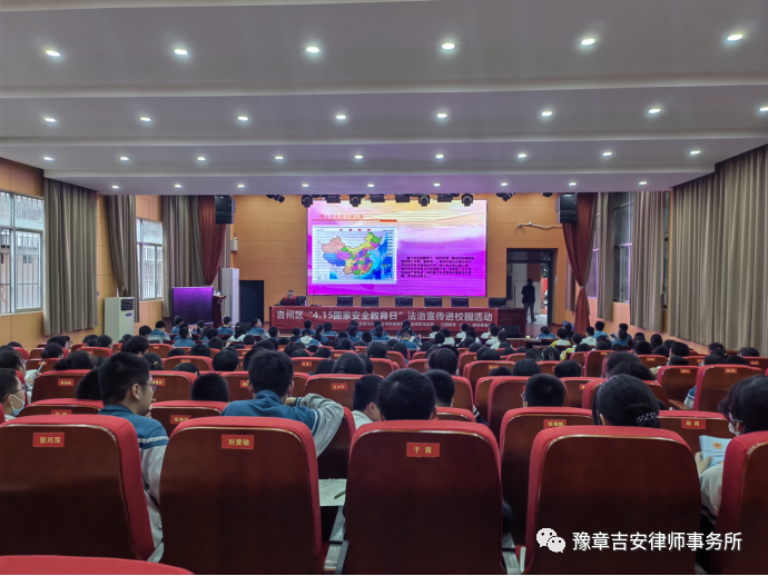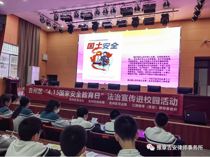 为深入宣传国家安全相关知识,培育青少年树立维护国家安全意识,4月14日下午,吉州区普法办、吉州区教体局、吉州区司法局联合江西豫章(吉安)律师事务所在吉安市第二中学开展“4.15全民国家安全教育日”法制宣传进校园活动。